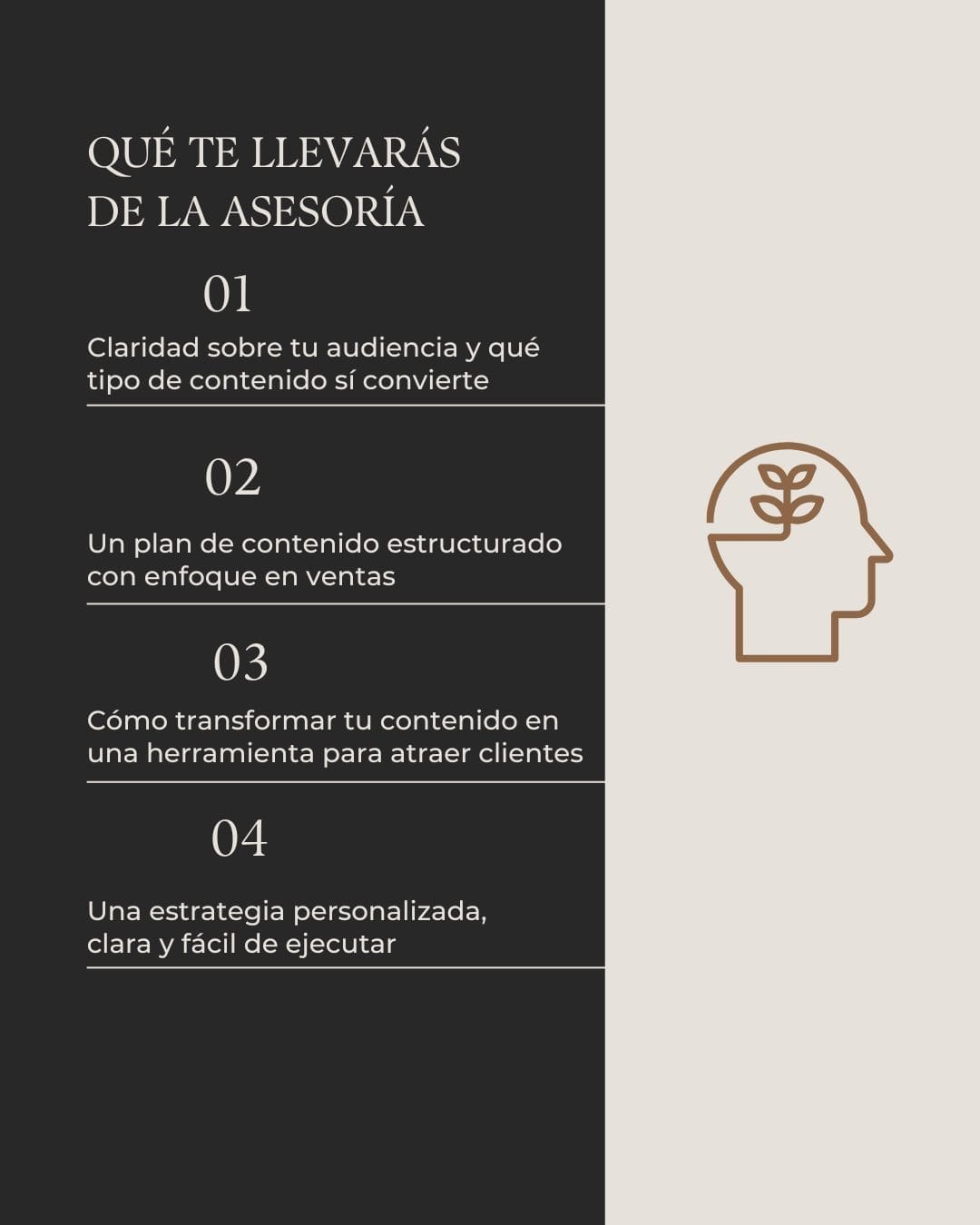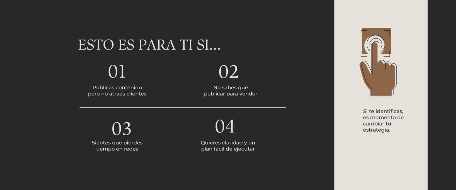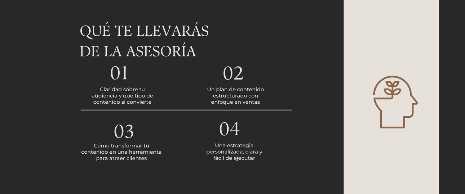 Te llevas claridad estratégica, un plan de contenido enfocado en ventas y una hoja de ruta clara para ejecutar sin improvisar.